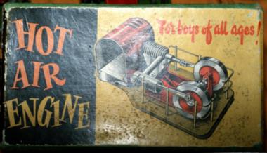 Toy hot air engine sold in the 1950's, price 30 shillings, sold with slogan "Hot Air Engine for boys of all ages!"